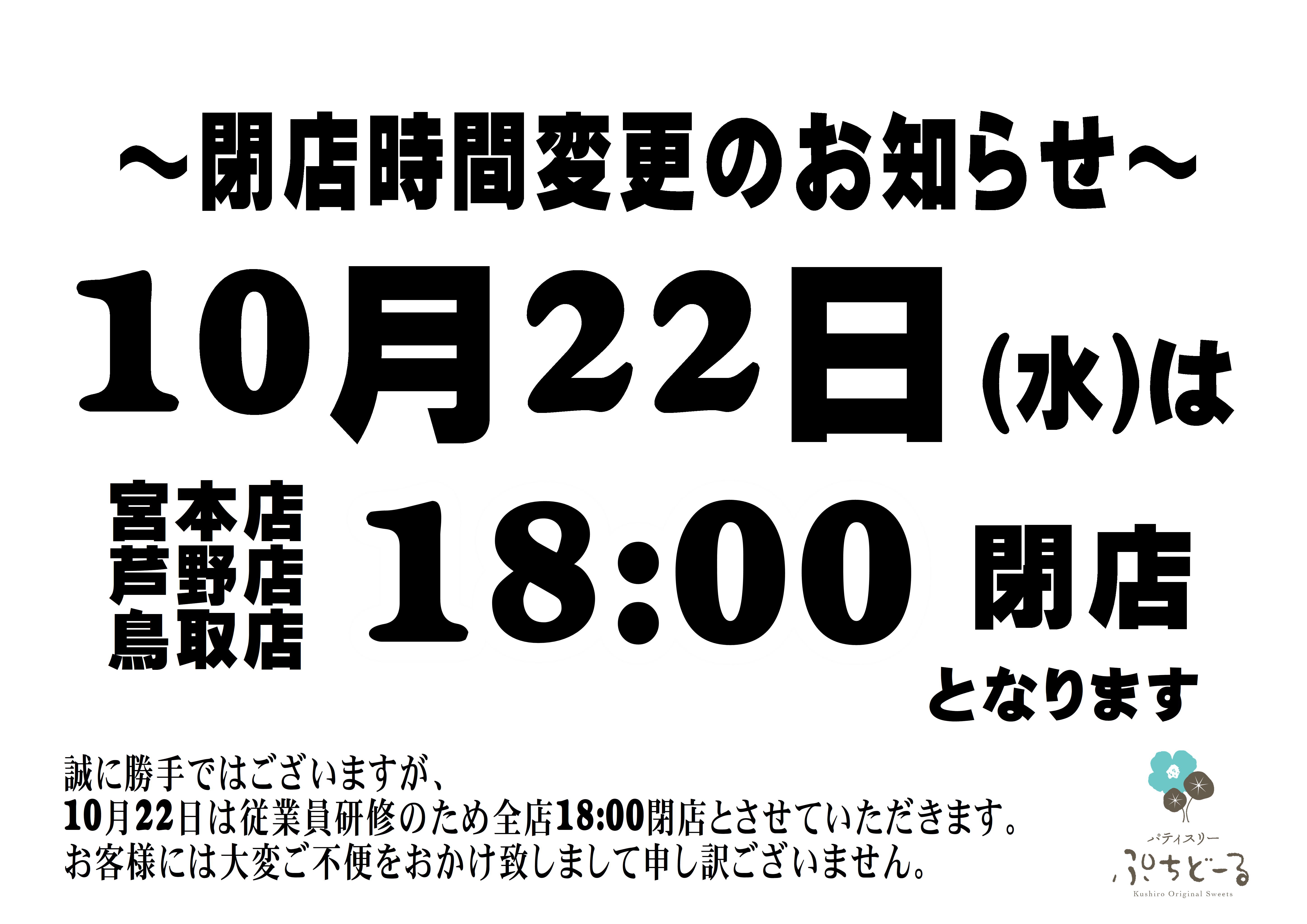 【釧路3店舗】閉店時間のお知らせ 10月22日のみ